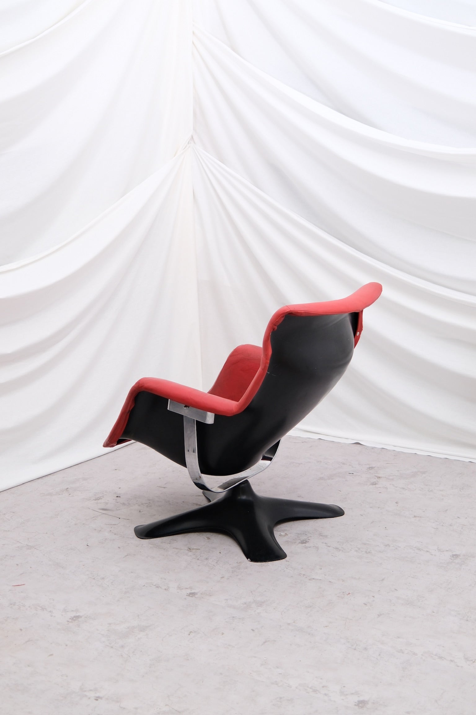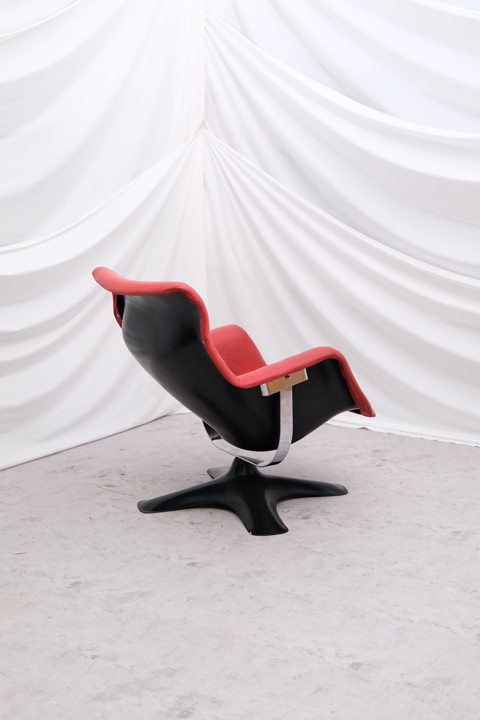 An original Karuselli lounge chair designed by Yrjö Kukkapuro for Haimi in the 1960s. This version features a striking red leather upholstery paired with a black fiberglass body and chrome-plated steel supports. The sculptural silhouette and low, organic form make...