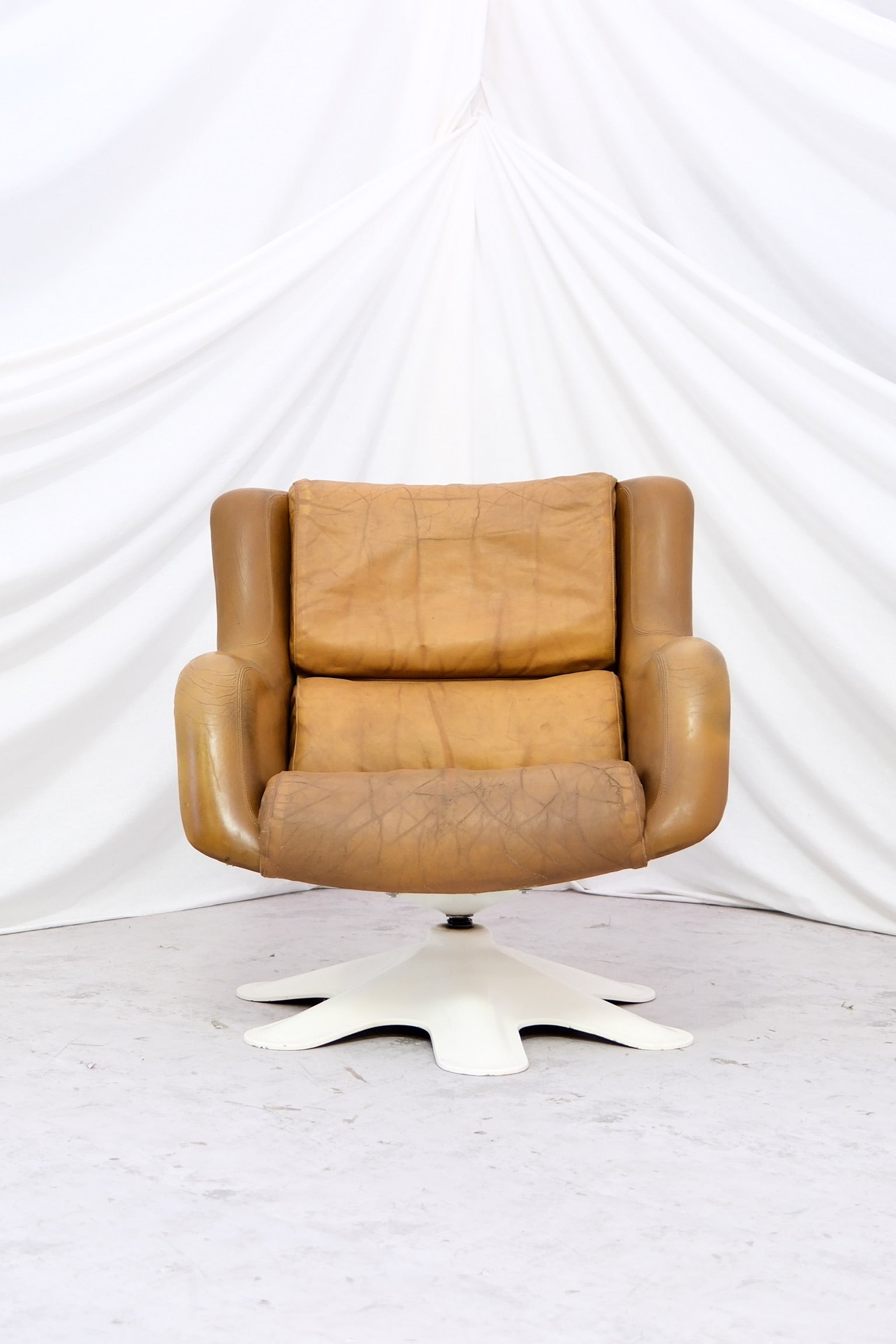Yrjö Kukkapuro Karuselli armchair - Haimi 1960s - Brown Leather Designed by Yrjö Kukkapuro for Haimi in the late 1960s, the 418 lounge chair is part of the iconic Karuselli family. The sculptural fibreglass shell and generous leather cushions give...