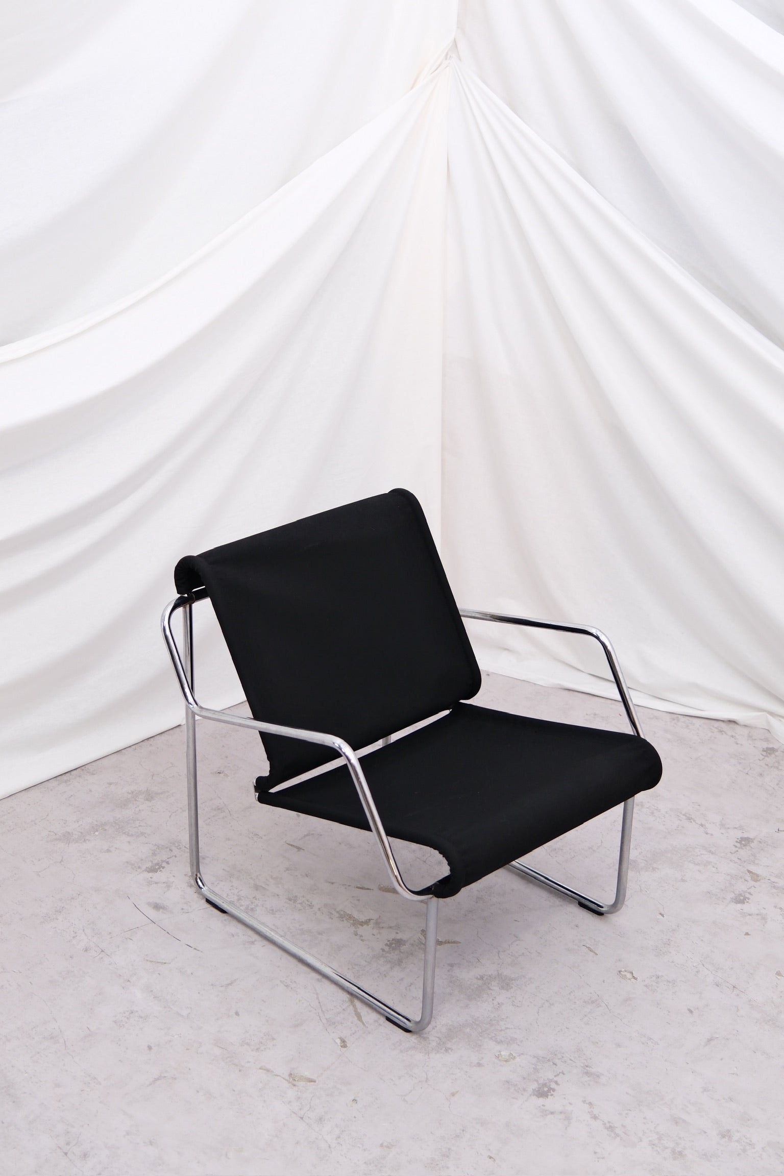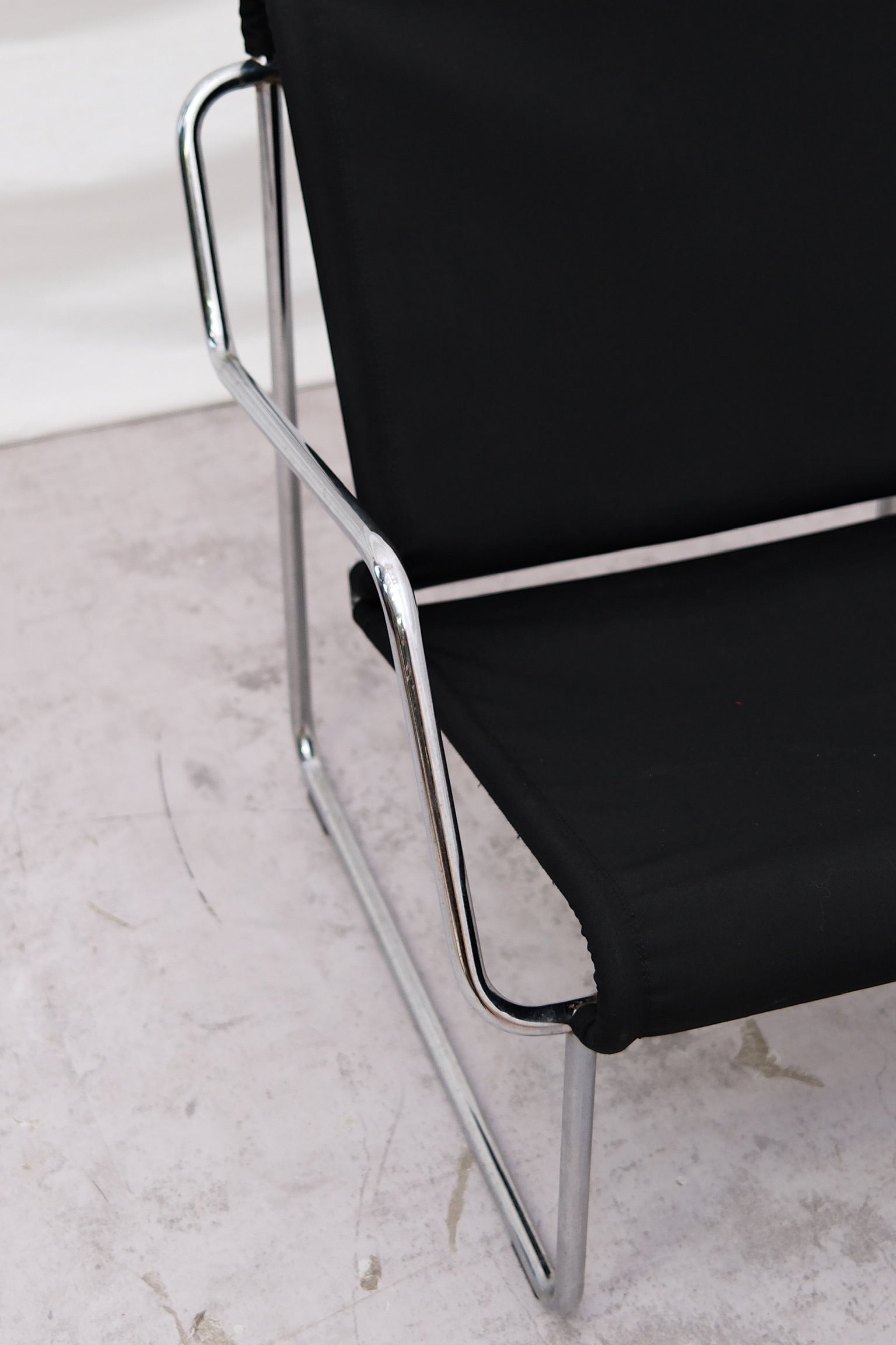 This piece is in good vintage condition. The steel frame remains solid and corrosion-free, and the fabric seat shows gentle wear without stains or tears. Please request detailed photos for specifics.