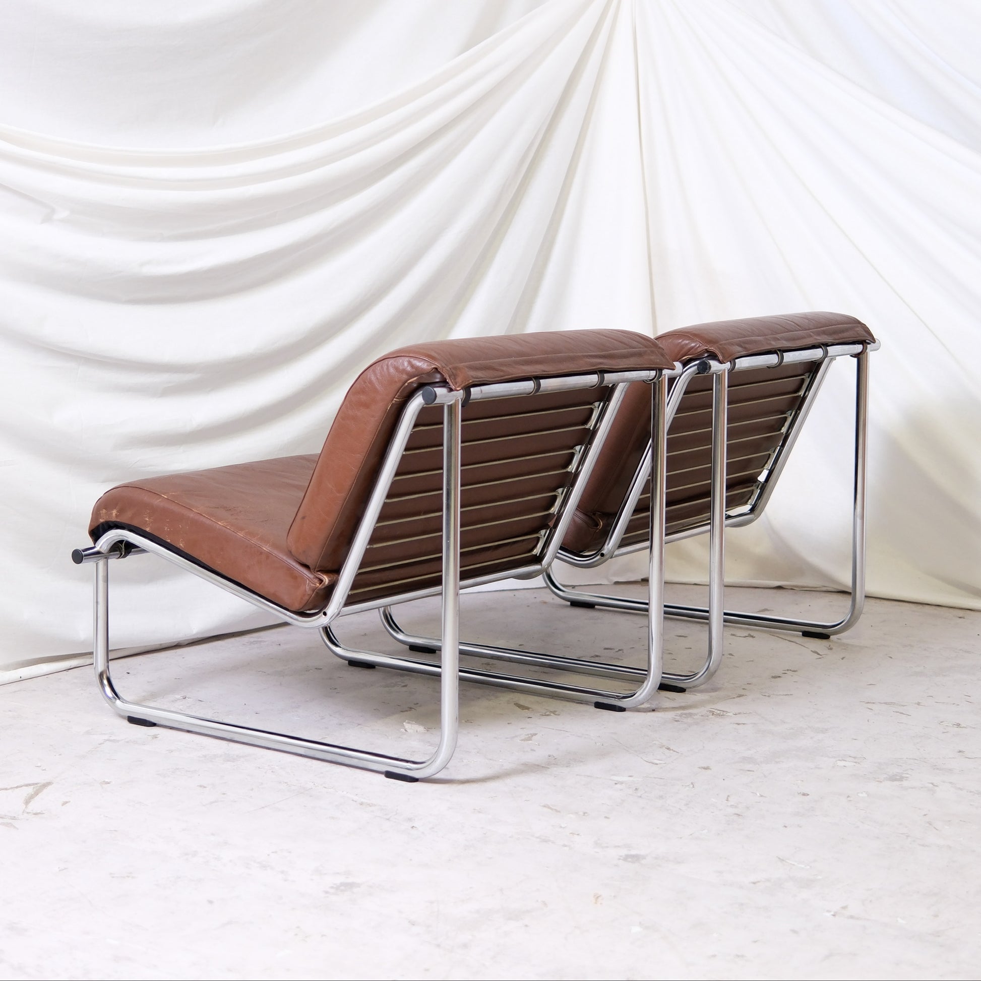 This pair features brown leather upholstery with chrome-plated tubular frames. The shape is open and lightweight, while the leather gives the chairs a warmer feel. They work well as lounge chairs in a living room, reading corner or studio space, and the low profile makes them easy to place without making the room feel heavy.