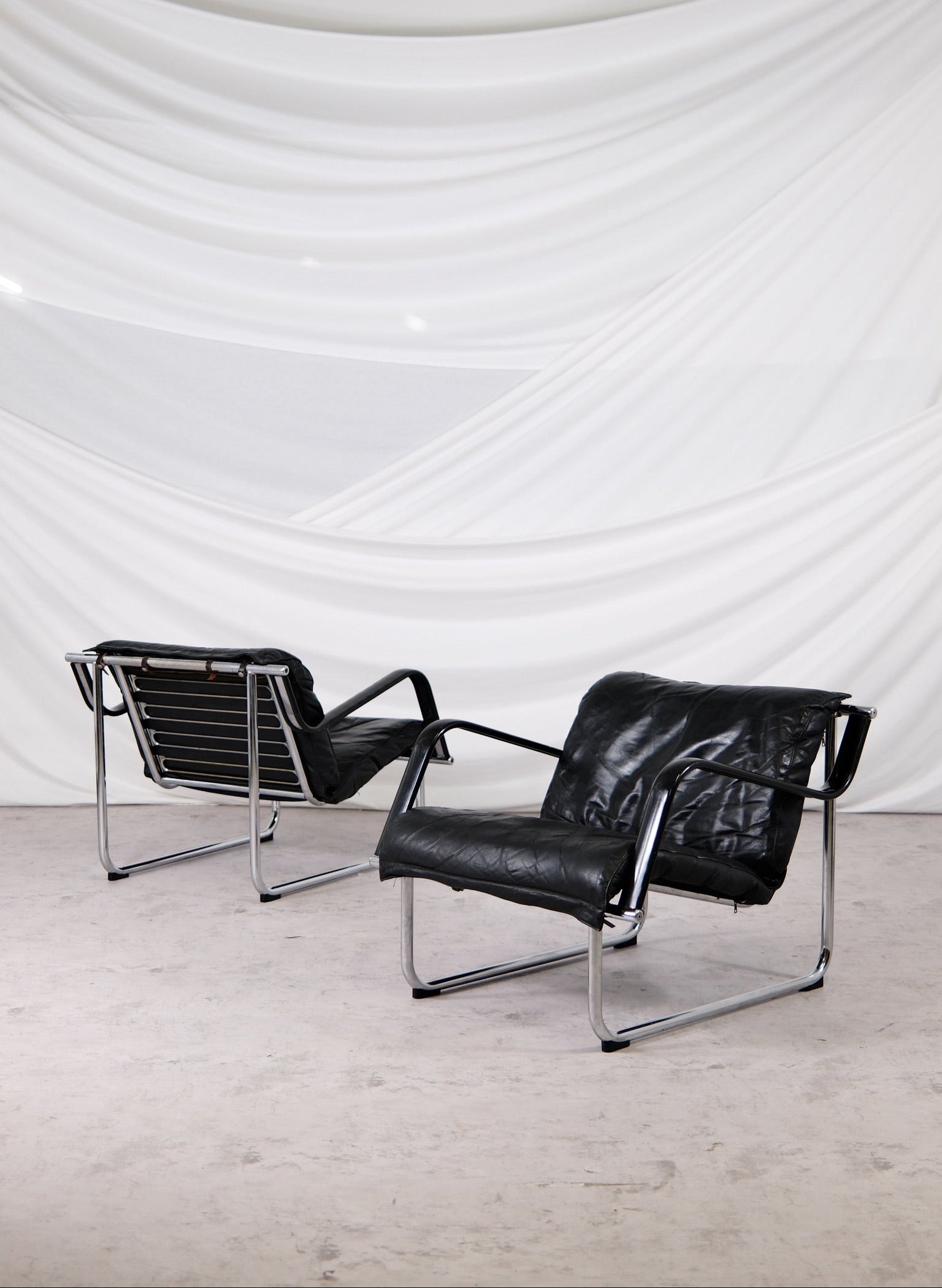 Pair of original Remmi armchairs by Yrjö Kukkapuro, low model. Designed in the 1960s, the Remmi series is celebrated for its comfort, functionality, and striking modernist form. The chairs feature tubular chrome frames with black leather upholstery, showcasing Kukkapuro’s signature balance between ergonomics and design clarity.