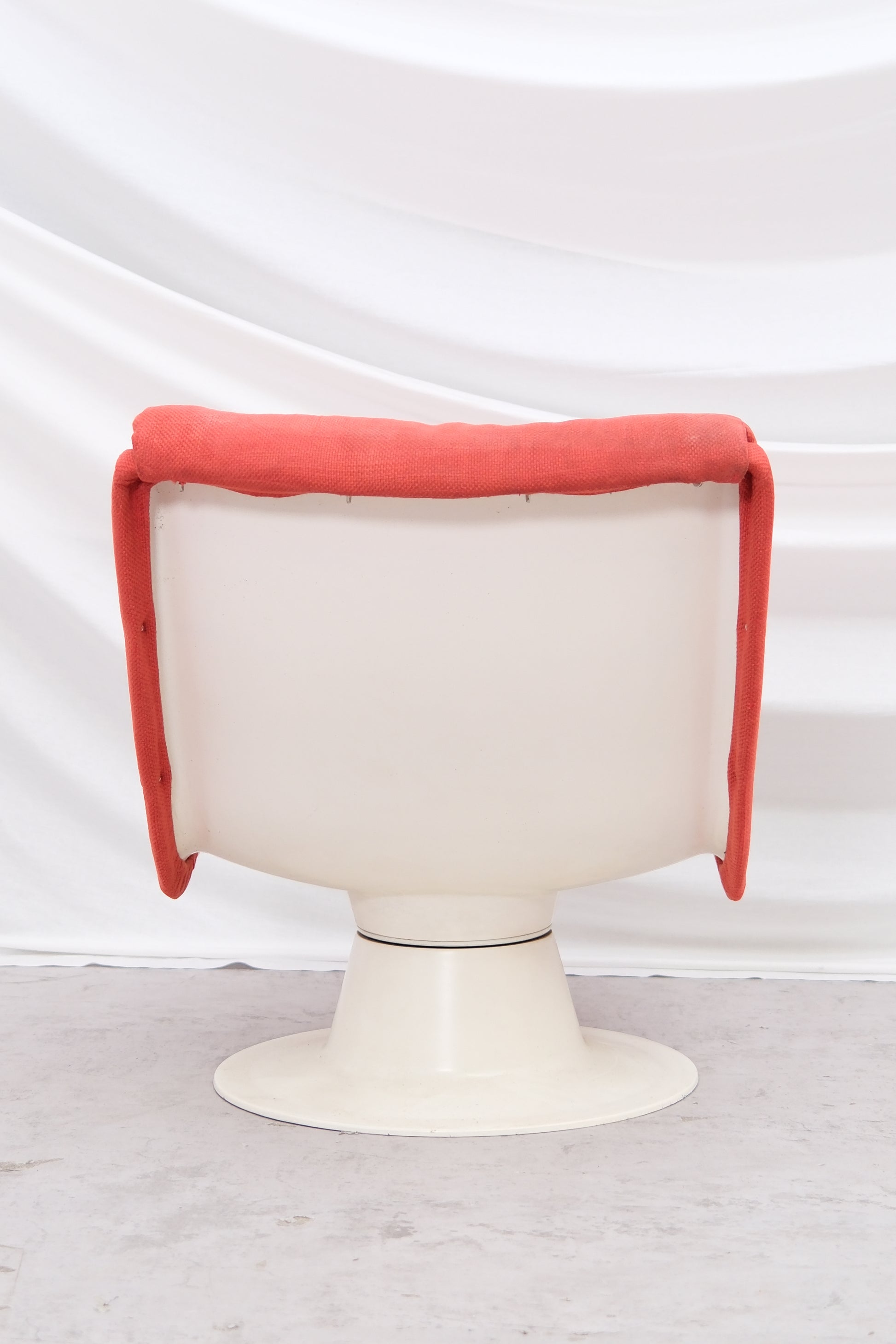 The bold red upholstery pairs beautifully with the white fiberglass shell, creating a striking contrast typical of Kukkapuro’s work for Haimi in the 1970s.