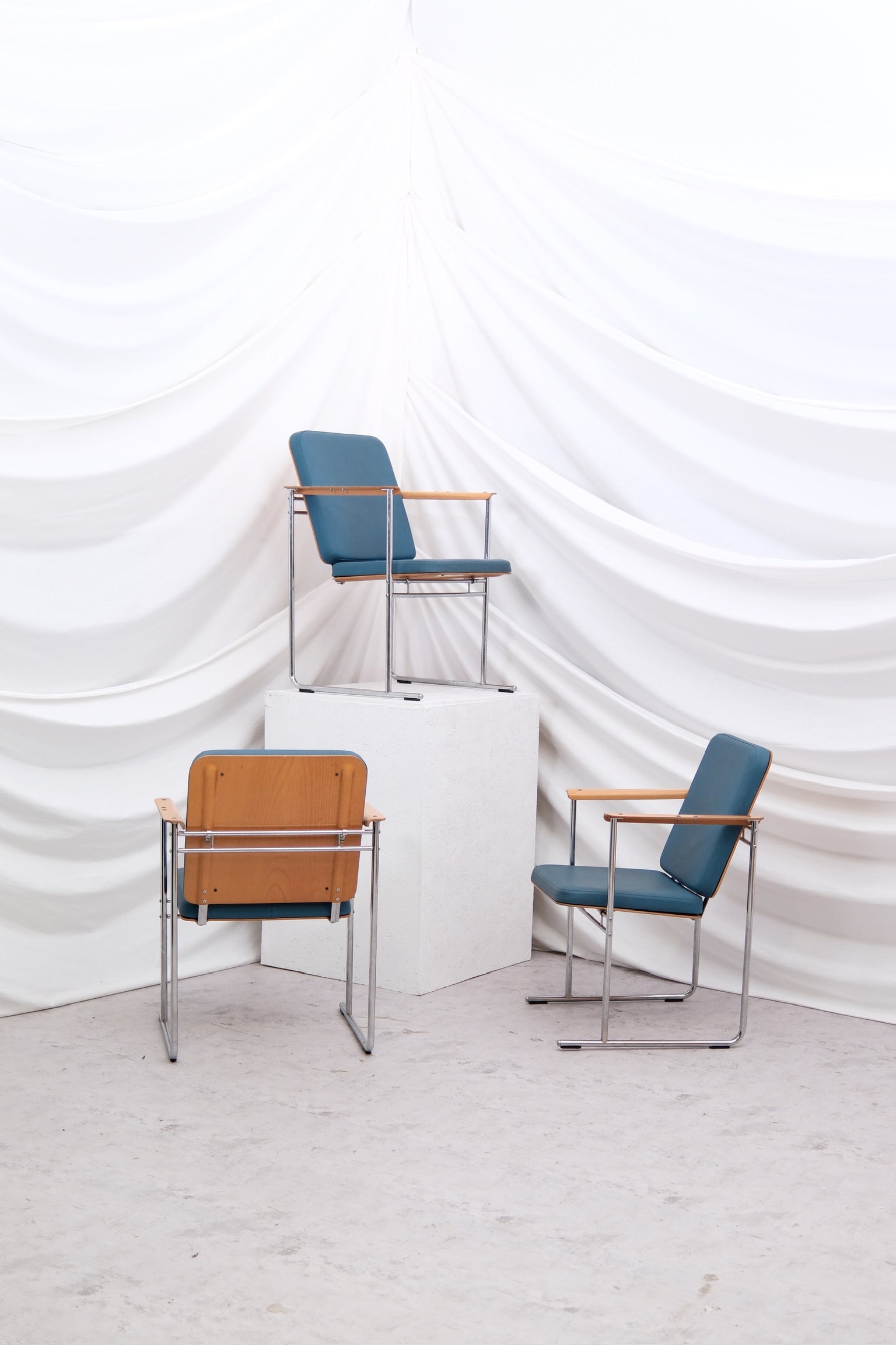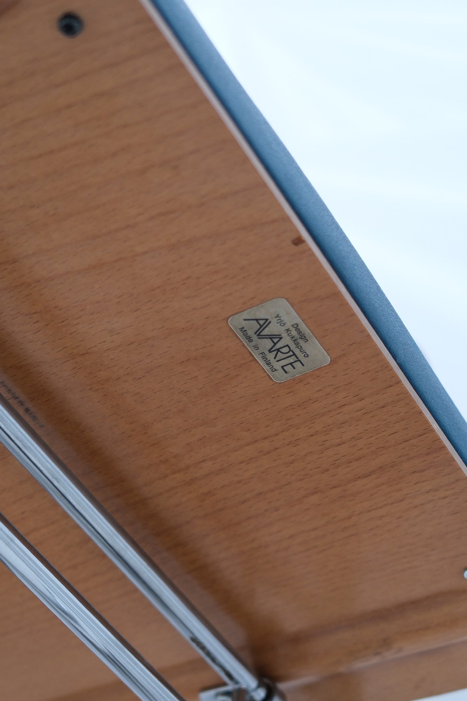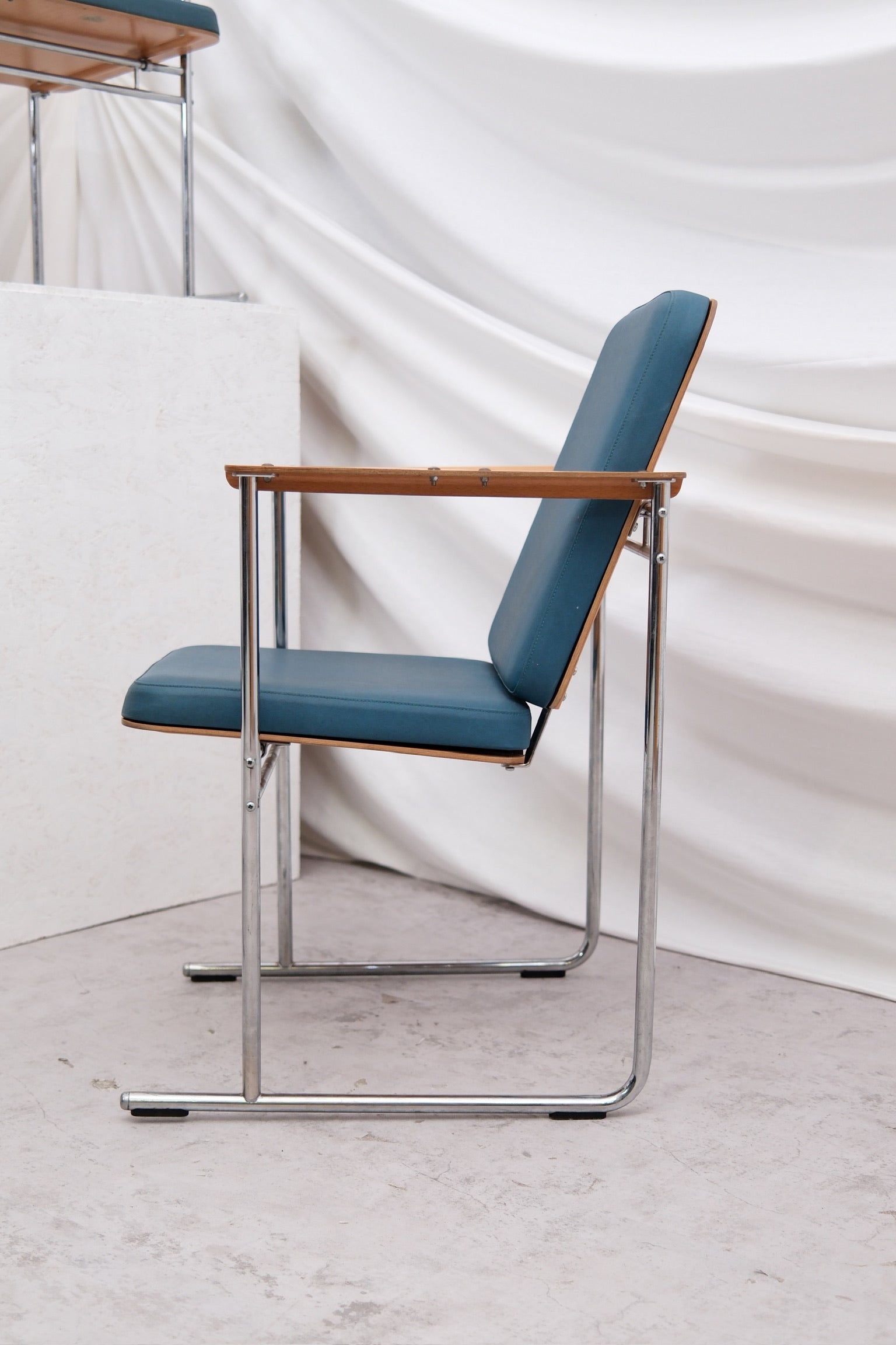 Designed by Yrjö Kukkapuro for Avarte, the Skaala armchair is a Finnish modernist classic that pairs ergonomic precision with a stripped-back, architectural aesthetic. This set of four features the original blue leather upholstery, chromed steel cantilever frames, and sculpted birch armrests a signature blend of Kukkapuro’s functionalist approach and visual clarity.